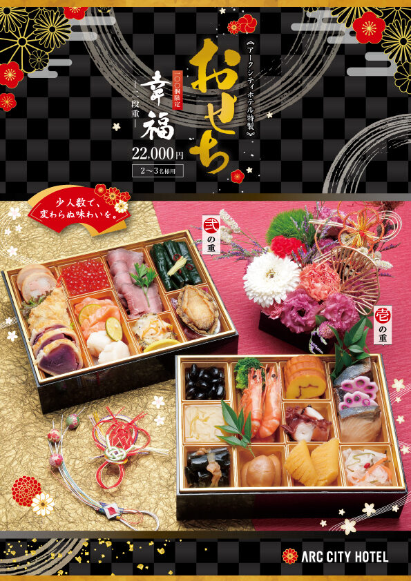 今年のおせちは、たくさんのお客様の声にお応えして昨年の3~4名様用から2~3名様用でご用意いたしました。おせちには欠かせない「黒豆」や「数の子」などの定番食材や「煮あわび」や「白老牛ローストビーフ」などのおすすめ食材をバランスよくぎゅっと詰め込んだおせちとなっております。年末を彩り豊かに「幸福」を呼ぶおせちをぜひご予約ください。